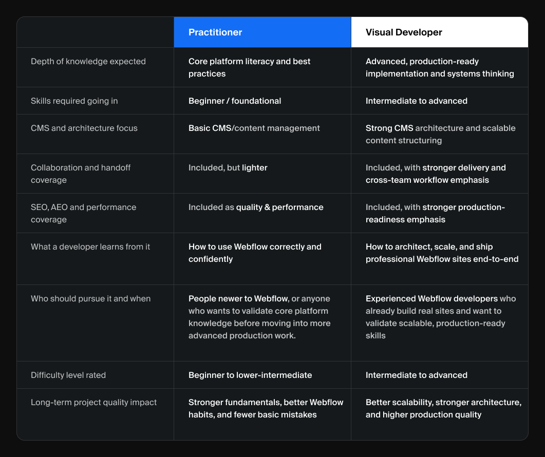 Clean CMS architecture, reusable systems, long-term maintainability, and production readiness are all part of building well in Webflow, and this certification maps much more closely to that level of work.